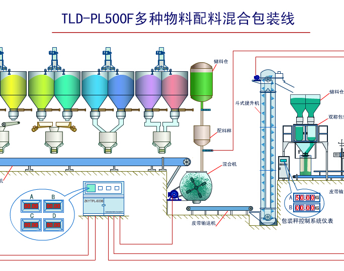 多物料配料混合包装线 多物料配料混合包装线广泛应用于石油化工、化肥、粮食、饲料、建材、冶金、陶瓷、玻璃等多行业的粒料、粉料、(不规则)块料、液体等多类型产品的配料、包装。